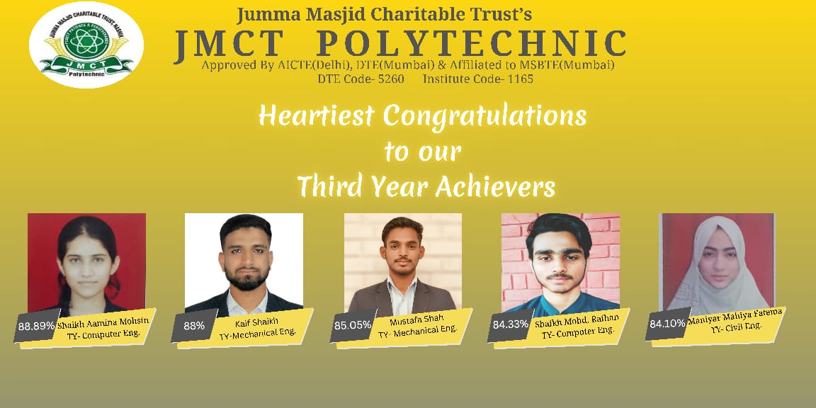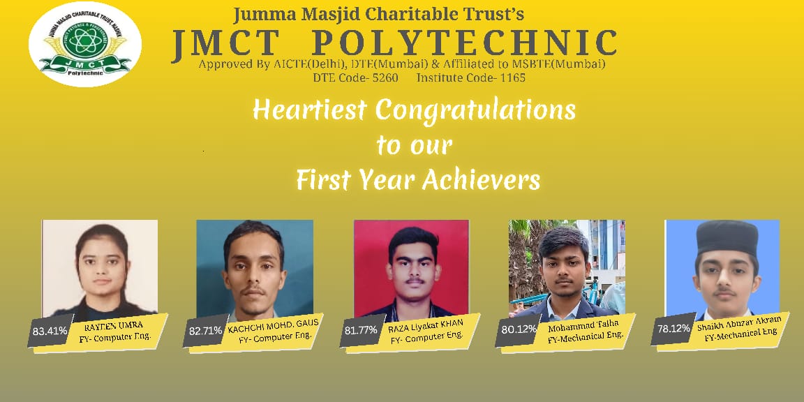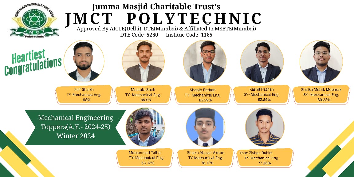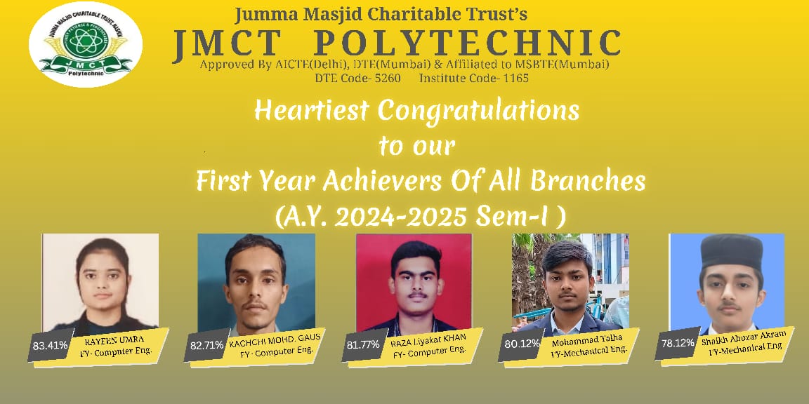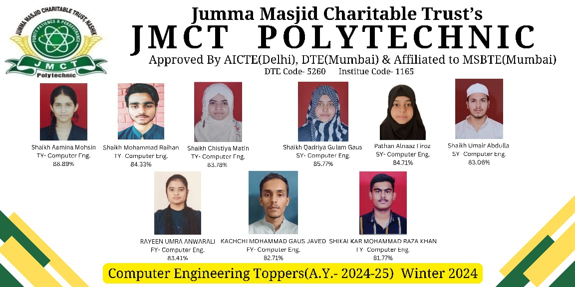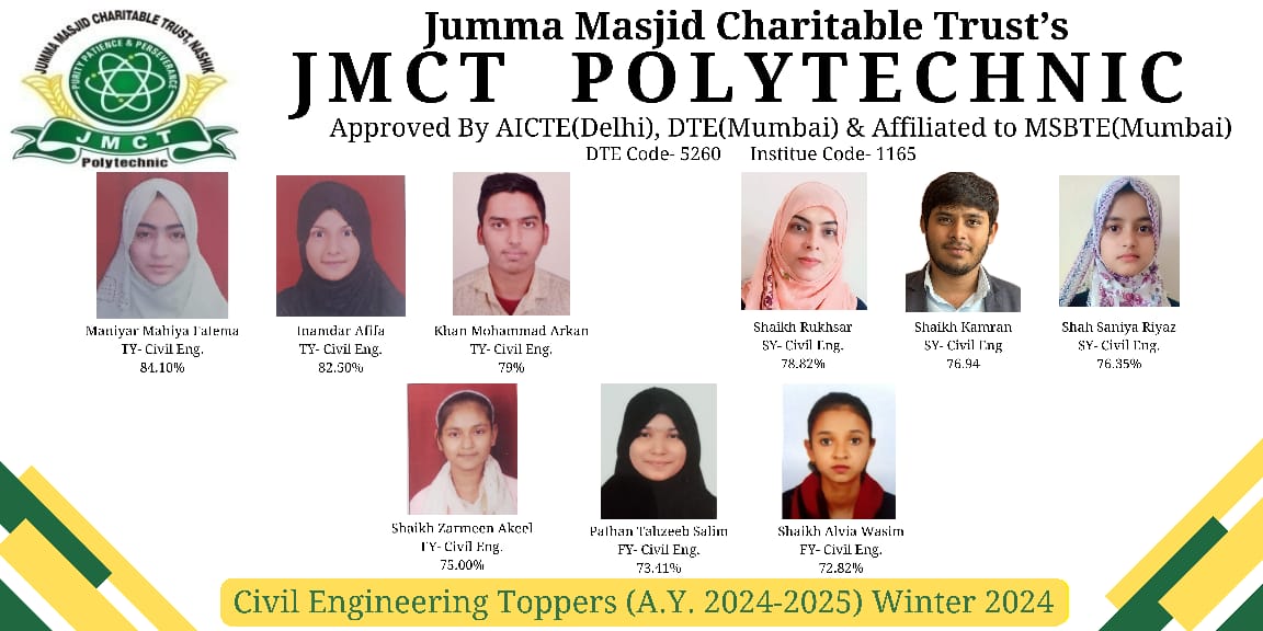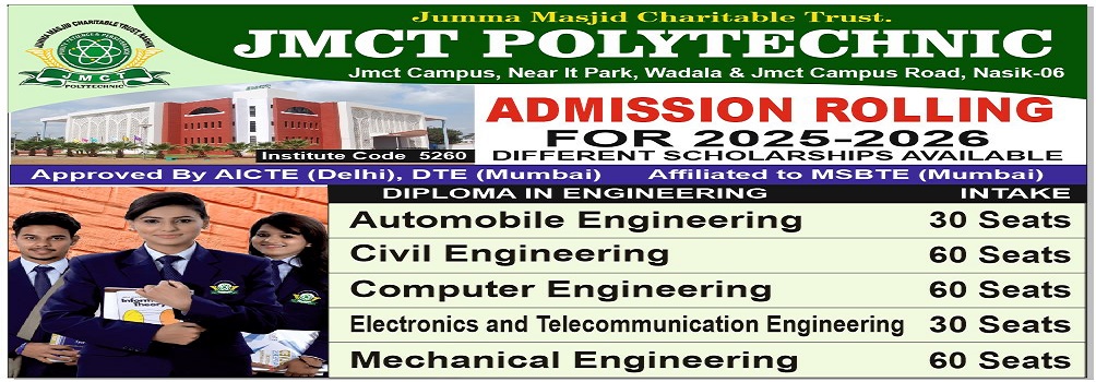 Located in Nasik, Maharashtra, on Wadala Road, Jumma Masjid Charitable Trust operates a premier institution for Diploma in Engineering & Technology education. Since its inception in 2009, the college has garnered prestigious approvals from AICTE (New Delhi), DTE (Mumbai), and affiliation with MSBTE (Mumbai).