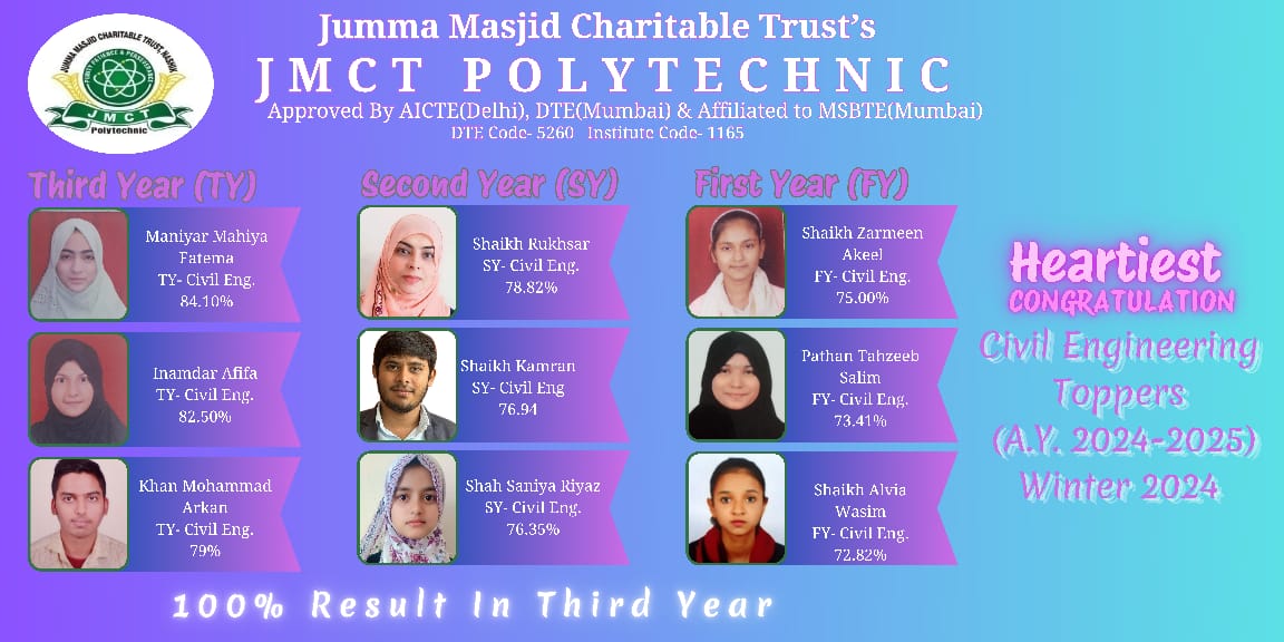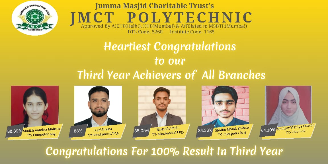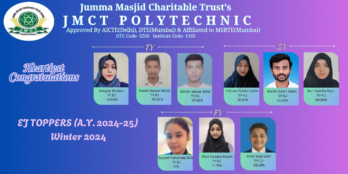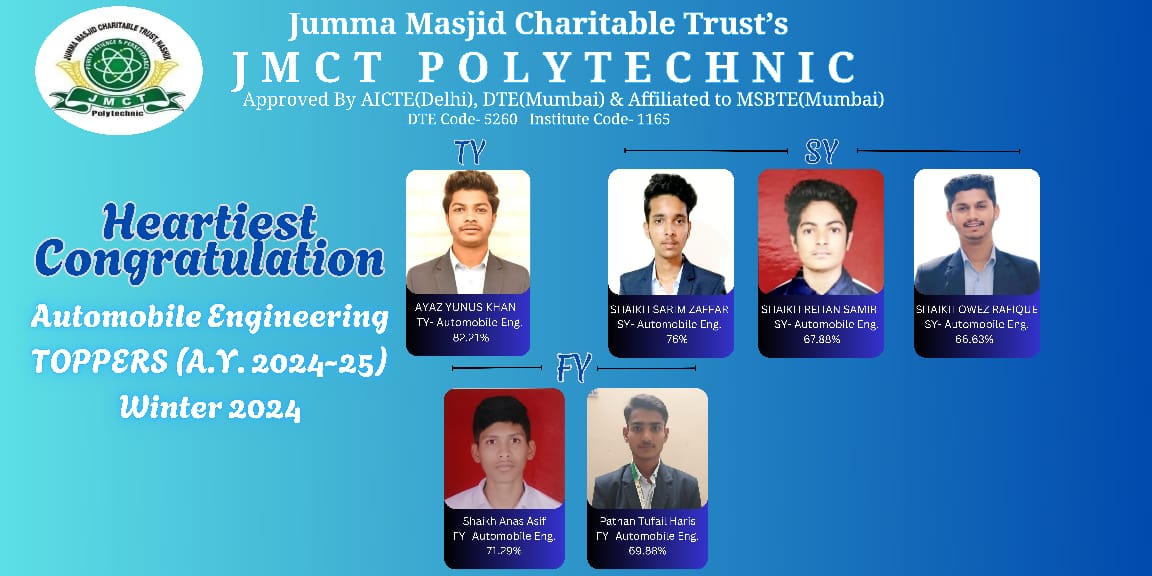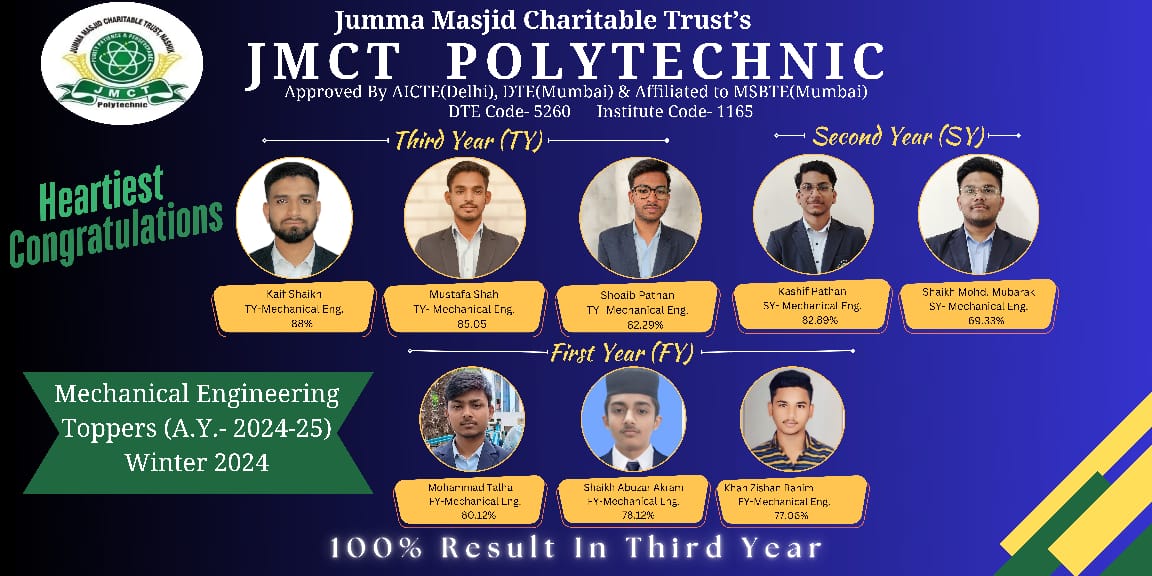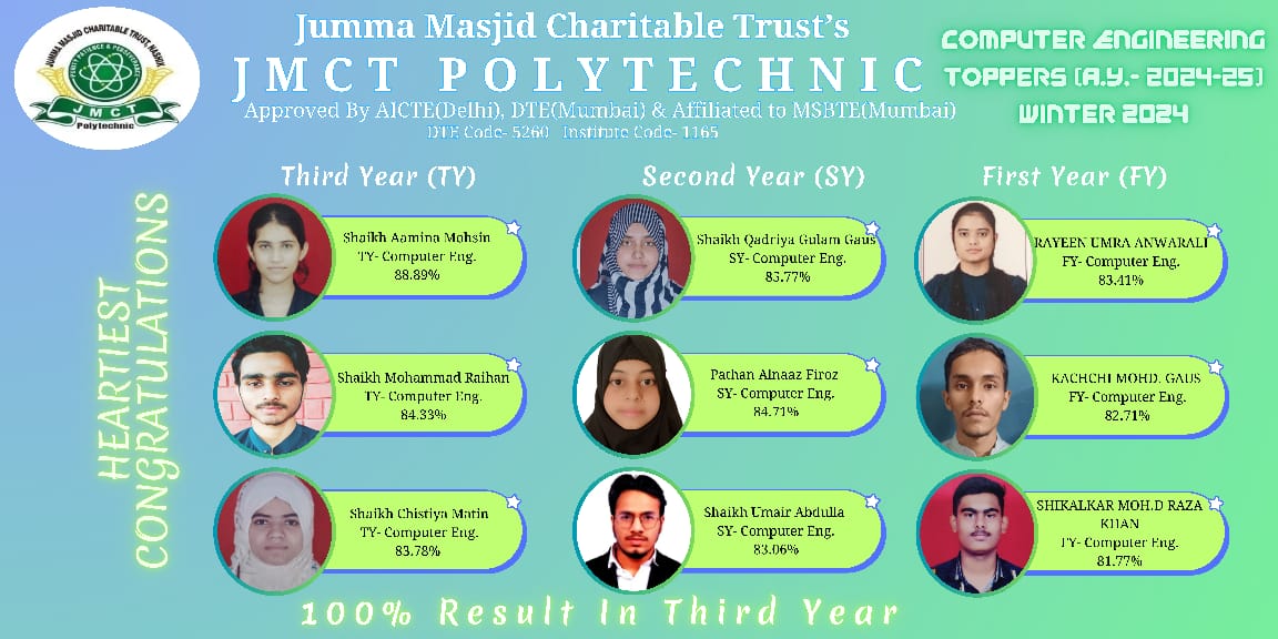 Located in Nasik, Maharashtra, on Wadala Road, Jumma Masjid Charitable Trust operates a premier institution for Diploma in Engineering & Technology education. Since its inception in 2009, the college has garnered prestigious approvals from AICTE (New Delhi), DTE (Mumbai), and affiliation with MSBTE (Mumbai).